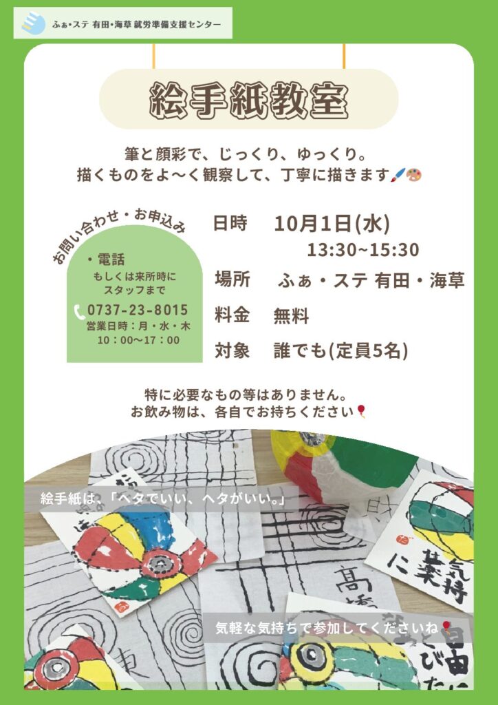 開催日 2025/10/1(水) 開催場所 ふぁ・ステ有田・海草 就労準備支援センター 時間 13:30~15:30 参加費 無料(道具はすべてご用意します) 定員 5名 お申込み先 〒649-0304 有田市箕島13-2 AGALA内 お電話にてお申込みください。 TEL:0737-23-8015 受... -